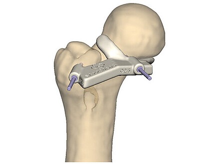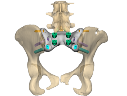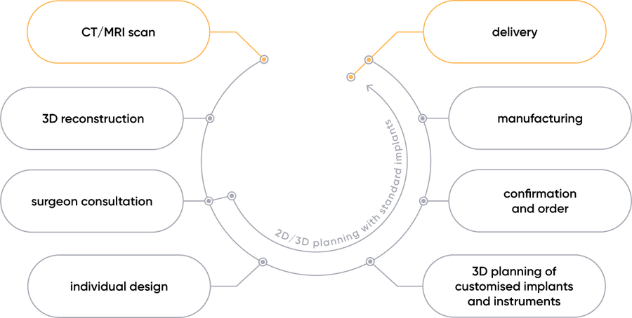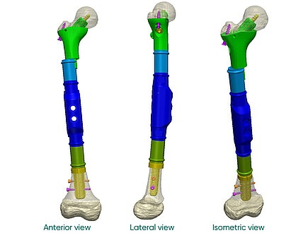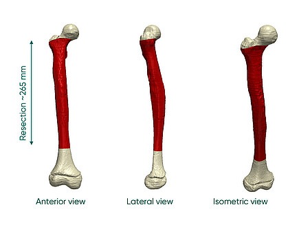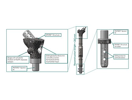 Zaplanowano system protezy składający się z indywidualnie wykonanego komponentu proksymalnego i dystalnego w połączeniu z implantem artrodezy MUTARS®. W przeciwieństwie do klasycznego elementu łączącego MUTARS® dla implantów diafizarnych, implant ten odwzorowuje naturalną krzywiznę kości udowej. Komponent proksymalny posiada poszerzenie z otworem do mocowania ścięgna mięśnia biodrowo-lędźwiowego oraz otwór do fiksacji krętarza większego. Ze względu na rozległą resekcję, dla części dystalnej zaplanowano indywidualny, wydrążony trzpień o owalnym kształcie.