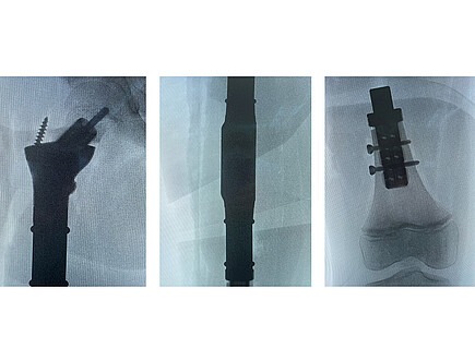 Chirurg był zadowolony z uzyskanego rezultatu. Pooperacyjne zdjęcia RTG przedstawiają komponent proksymalny (po lewej), komponent dystalny (po prawej) oraz implant artrodezy MUTARS® (centralnie).