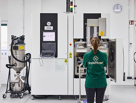 Cyfrowe dane 3D (CAD) są w pierwszym etapie łączone w partie produkcyjne w dziale wytwarzania addytywnego i przygotowywane do produkcji w systemach EBM® przy użyciu specjalistycznego oprogramowania. Przed rozpoczęciem właściwego procesu produkcyjnego komora robocza zostaje poddana wysokiej próżni. Następnie struktura i geometria komponentów implantu są automatycznie budowane warstwa po warstwie poprzez nanoszenie proszku o grubości około 50 µm i jego stapianie wiązką elektronów. Mimo że wiązka elektronów porusza się z prędkością do 8 000 m/s, wytworzenie jednej partii produkcyjnej może trwać kilka dni.